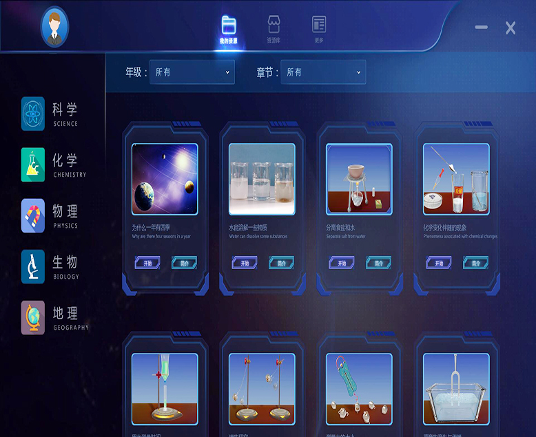 根據(jù)國(guó)家課程標(biāo)準(zhǔn)中的實(shí)驗(yàn)要求,運(yùn)用虛擬仿真技術(shù)構(gòu)建虛擬學(xué)科實(shí)驗(yàn)室,構(gòu)建高度仿真的虛擬實(shí)驗(yàn)環(huán)境和實(shí)驗(yàn)操作對(duì)象,學(xué)生可以自主選擇不同實(shí)驗(yàn),在虛擬的環(huán)境下進(jìn)行實(shí)驗(yàn)觀(guān)摩、模擬實(shí)驗(yàn)、拓展訓(xùn)練等操作,在虛擬實(shí)驗(yàn)的互動(dòng)體驗(yàn)中更深入的學(xué)習(xí)知識(shí)。虛擬學(xué)科實(shí)驗(yàn)室的分類(lèi):虛擬化學(xué)實(shí)驗(yàn)室、虛擬物理實(shí)驗(yàn)室、虛擬生物實(shí)驗(yàn)室。
